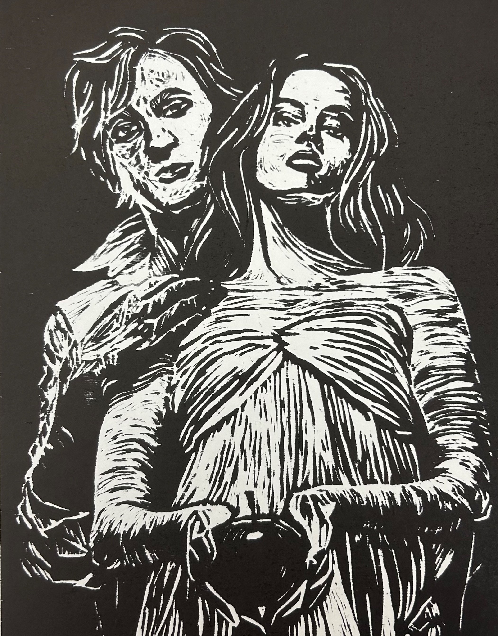 Bella and Edward, 2024, 11”L 14”W, Woodblock print. Ink on paper.