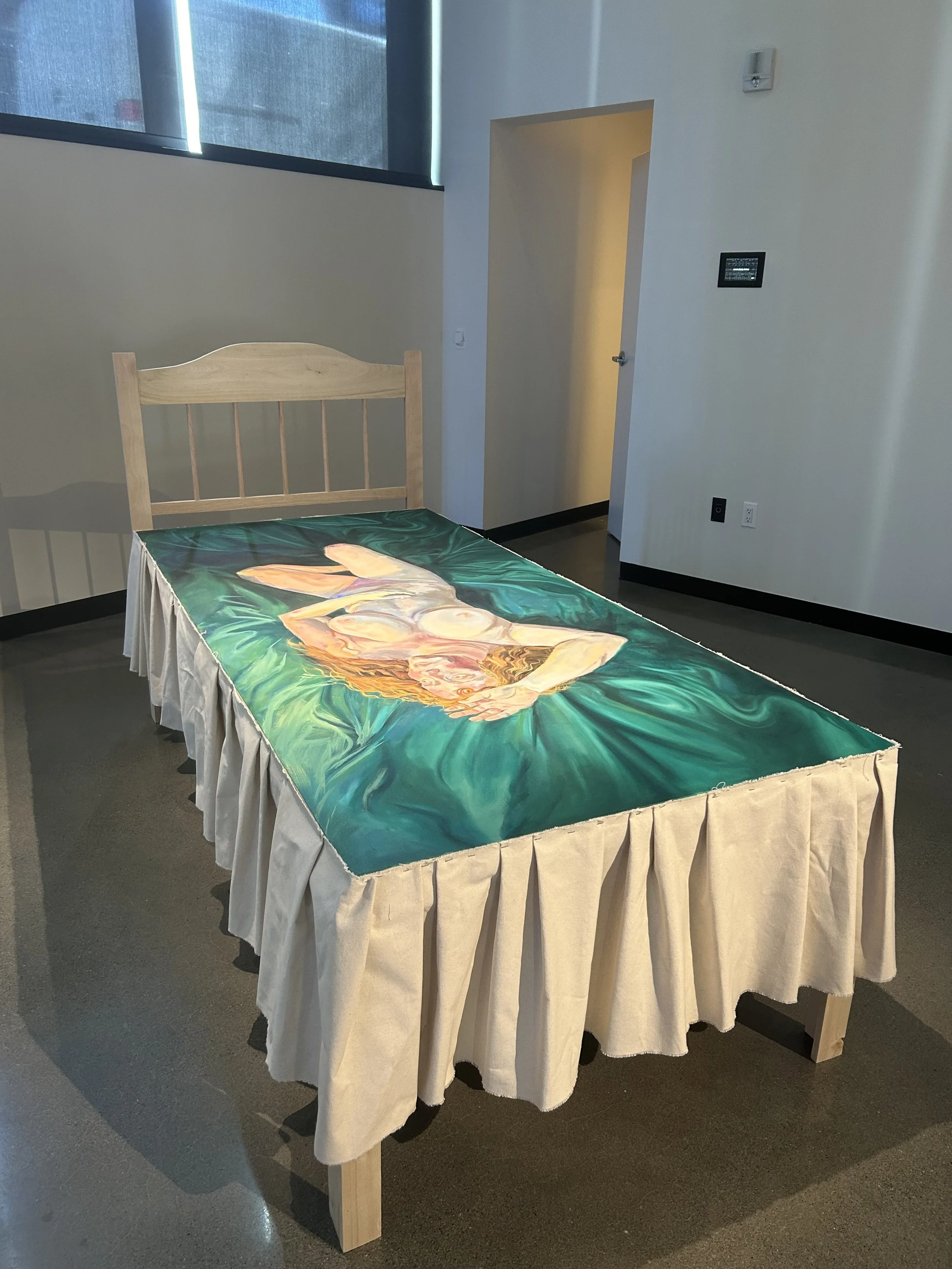 Stretched, 2024, 85”L 41.5”W 48”H, Oil on canvas, wood.
